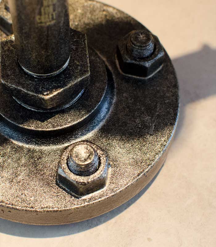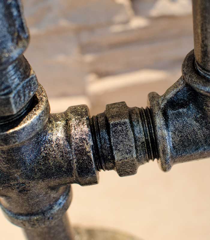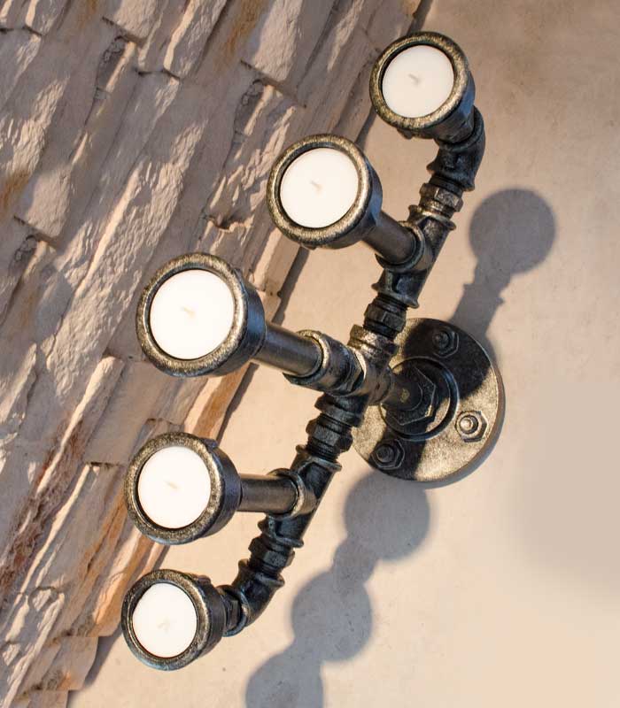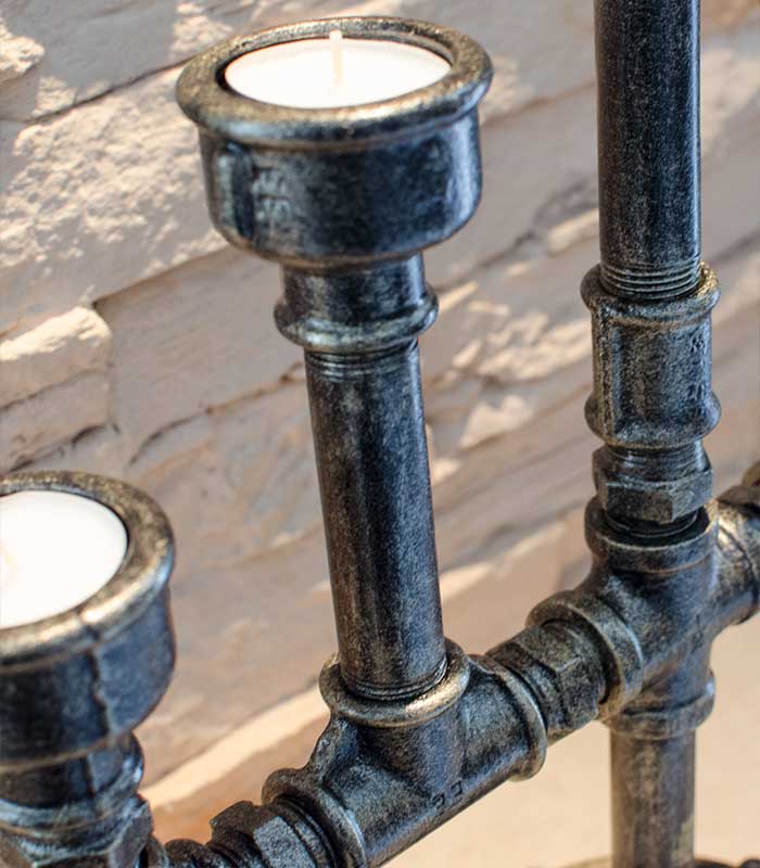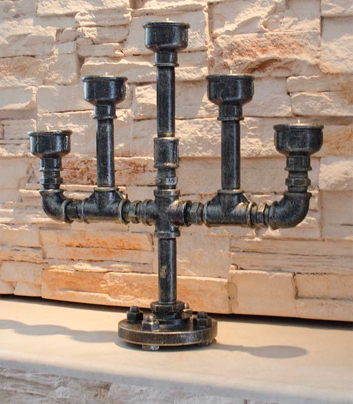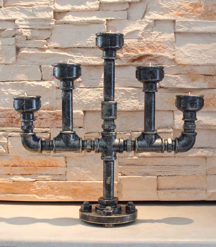 This is a black candlestick of five candles aged with cold coloring. It is made of pipe metal fittings and distressed with coloring processes, no chemicals involved. Some details have been colored in a way to emphasize the aging of the project.