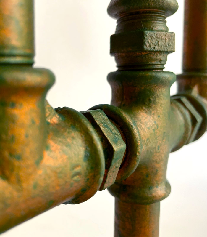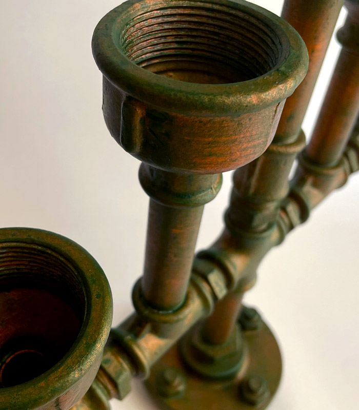 This is a distressed copper candlelight of five candles aged with cold coloring. It is made of pipe metal fittings and distressed with coloring processes, no chemicals involved. Some details have been colored in a way to emphasize the aging of the project.